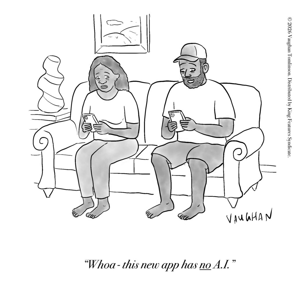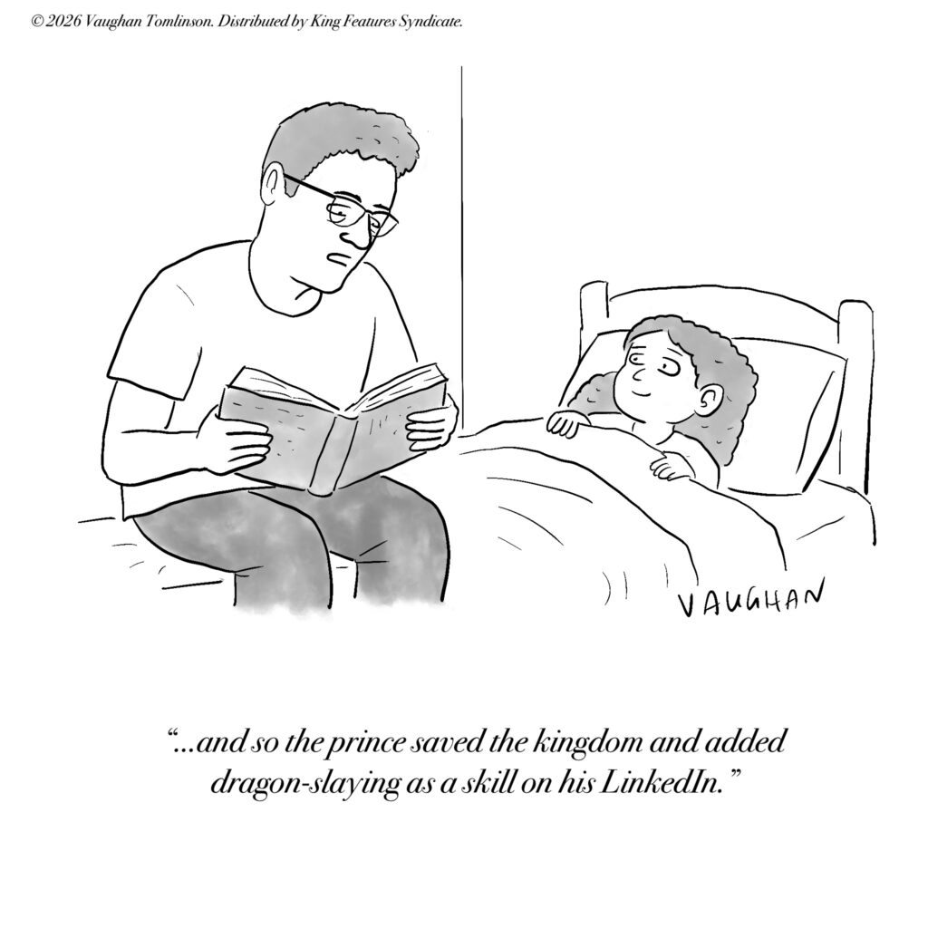Vaughan’s path into cartooning wasn’t immediate either. He grew up loving comics, but didn’t see it as a realistic career until much later. It started as something occasional, then something more serious during the pandemic, and eventually something consistent. Submitting batches of cartoons each week, tracking what lands where, building a rhythm that feels equal parts structured and chaotic.